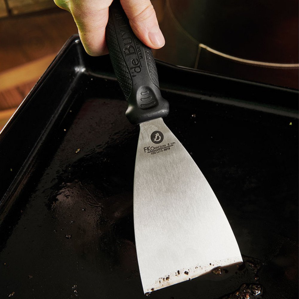 Com o seu formato especial, esta espátula permite limpar grelhas e placas. Sua largura e ângulos agudos também permitem cortar ou espalhar substâncias pastosas ou descascar chocolates das assadeiras.