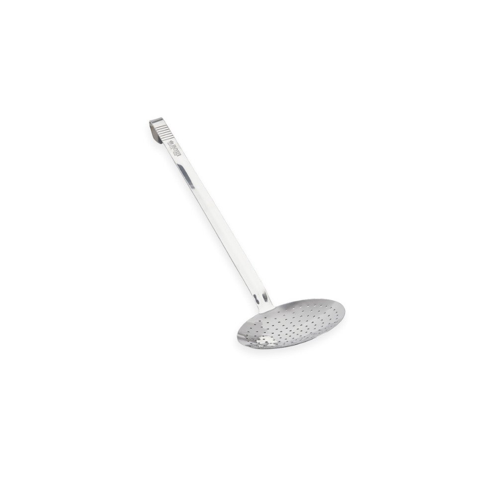Para recuperar e coar alimentos que subiram à superfície do líquido de cozimento. Utensílio profissional de aço inoxidável para serviços pesados. Cabo largo, 2,5 mm de espessura, muito rígido.