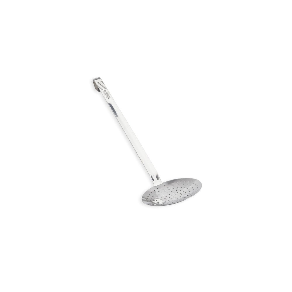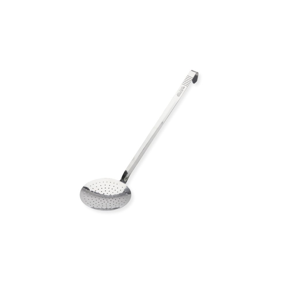 Para recuperar e coar alimentos que subiram à superfície do líquido de cozimento. Utensílio profissional de aço inoxidável para serviços pesados. Cabo largo, 2,5 mm de espessura, muito rígido.