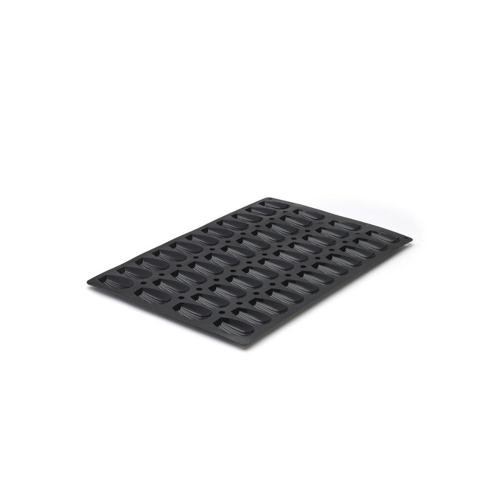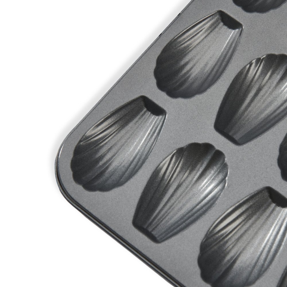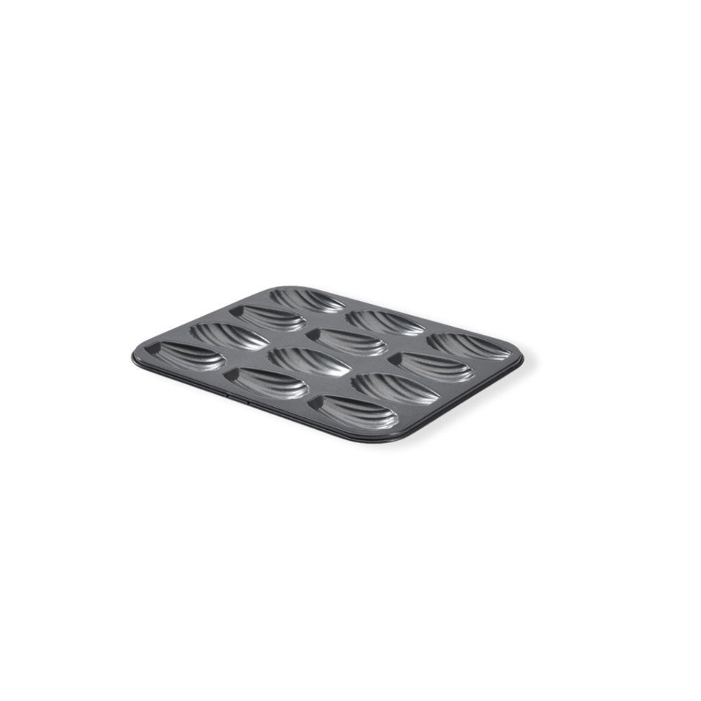 Bandeja pesada de aço grosso de 12 moldes para assar doces individuais. 12 madeleines tradicionais. Moldes dispostos de modo a otimizar a circulação do ar quente.