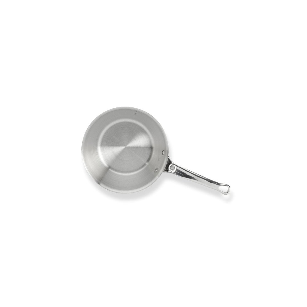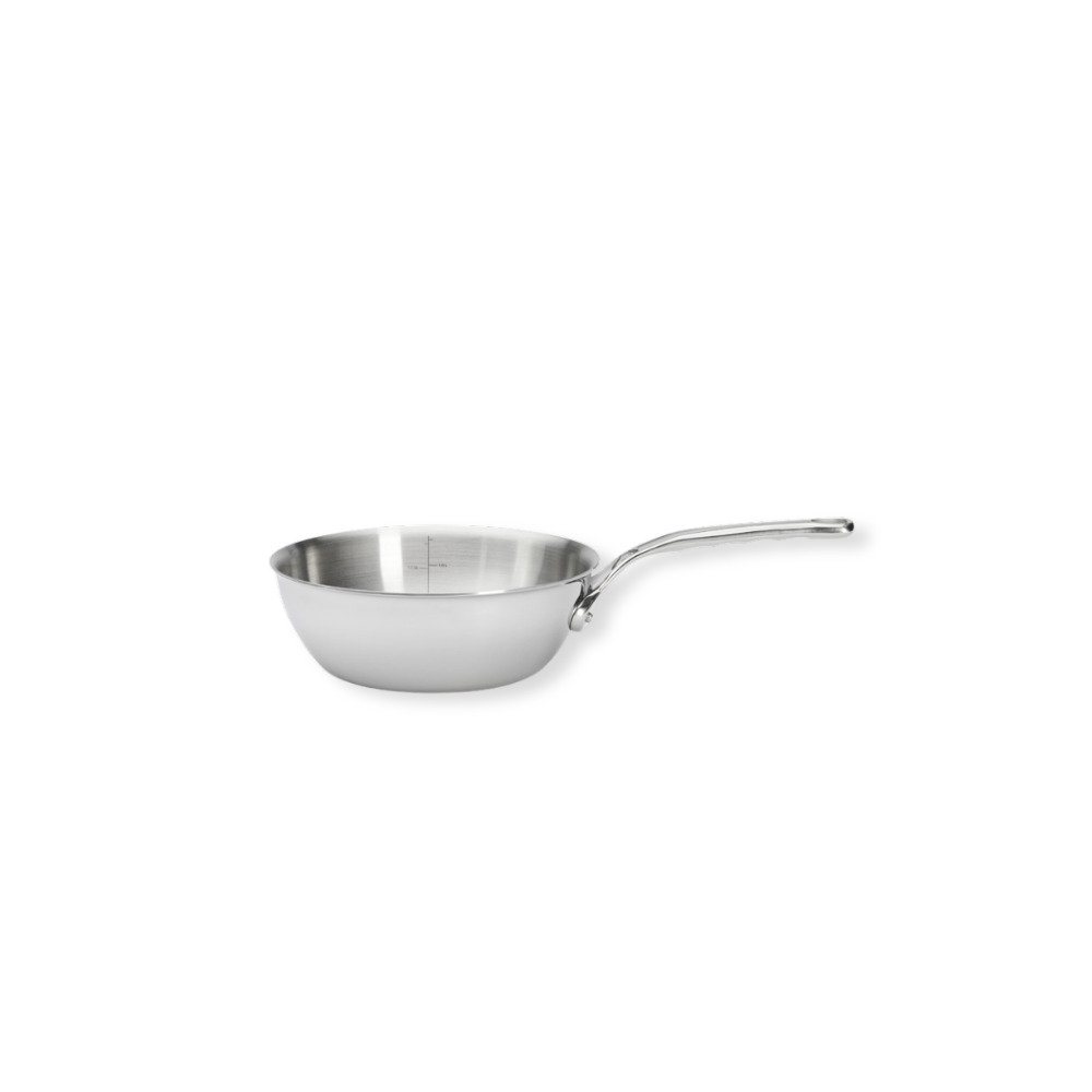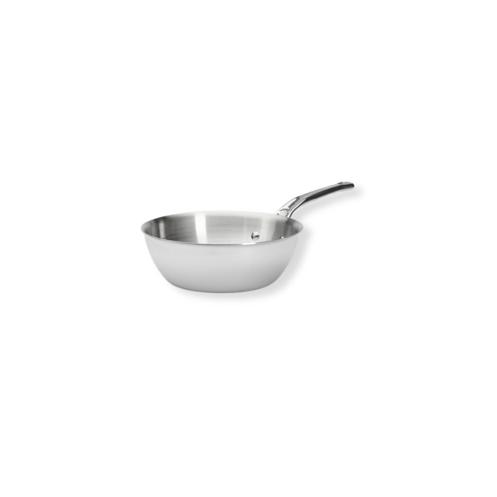Frigideira com borda reta para despejar, ideal para refogar vegetais e pedaços de carne. Utensílios de cozinha indeformáveis em material multicamadas: uma combinação de aço inoxidável no exterior e alumínio no interior.