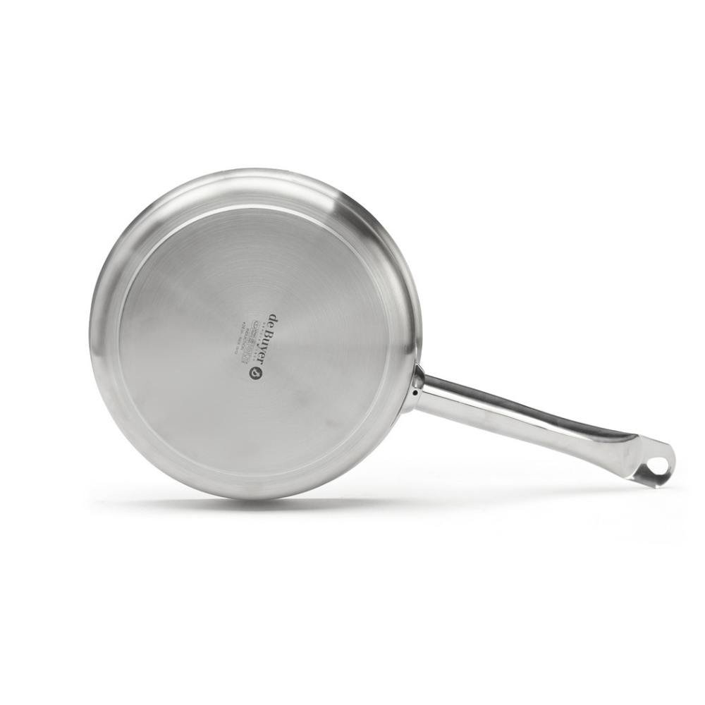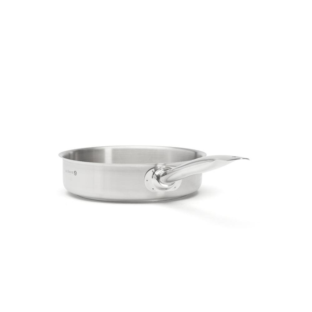 Frigideira redonda com borda alargada de aço inox, ideal para reduzir molhos graças ao seu formato que permite maior evaporação.